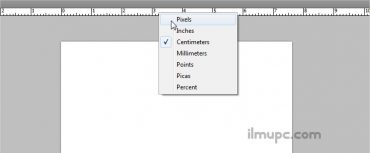Langkah selanjutnya yaitu mengatur satuan penggaris pada lembar kerja. Jika penggaris belum muncul, cobalah tekan CTRL+R. Jika sudah, klik kanan pada bagian penggaris, lalu pilih Pixels.