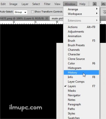 Selain undo dan redo, kamu juga bisa melihat riwayat perlakuan yang kamu kerjakan di Photoshop. Jadi kamu bisa kembali pada perlakuan-perlakuan tertentu pada lembar kerja yang sedang kamu kerjakan. Misalnya kamu ingin langsung ke perlakuan crop yang sebelumnya sudah kamu lakukan, maka tinggal sekali klik kamu akan kembali ke tahap yang kamu maksud. Fitur ini disebut history pada Photoshop. Untuk menampilkan dialog history sangat mudah, yaitu cukup klik pada menu bar Windows > History.