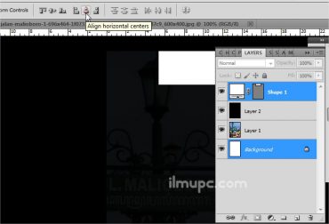 Buatlah persegi panjang pada sisi atas saja, kemudian dibuat rata tengah. Caranya seleksi Shape 1 (persegi panjang) dan background dengan menekan SHIFT+klik pada kedua layer, kemudian pilih Align horizontal centers.